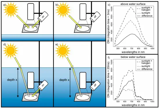 Freshwater lakes provide many important ecosystem functions and services to support biodiversity and human well-being. Proximal and remote sensing methods represent an efficient approach to derive water quality indicators such as optically active substances (OAS). Measurements of above-ground remote and in situ proximal sensors, however, are limited to observations of the uppermost water layer. We tested a hyperspectral imaging system, customized for underwater applications, with the aim to assess concentrations of chlorophyll a (CHLa) and colored dissolved organic matter (CDOM) in the water columns of four freshwater lakes with different trophic conditions in Central Germany. We established a measurement protocol that allowed consistent reflectance retrievals at multiple depths within the water column independent of ambient illumination conditions. Imaging information from the camera proved beneficial for an optimized extraction of spectral information since low signal areas in the sensor’s field of view, e.g., due to non-uniform illumination, and other interfering elements, could be removed from the measured reflectance signal for each layer. Predictive hyperspectral models, based on the 470 nm–850 nm reflectance signal, yielded estimates of both water quality parameters (Rtextasciicircum2 = 0.94, RMSE = 8.9 textmug L-1 for CHLa; Rtextasciicircum2 = 0.75, RMSE = 0.22 m-1 for CDOM) that were more accurate than commonly applied waveband indices (Rtextasciicircum2 = 0.83, RMSE = 13.2 textmug L-1 for CHLa; Rtextasciicircum2 = 0.66, RMSE = 0.25 m-1 for CDOM). Underwater hyperspectral imaging could thus facilitate future water monitoring efforts through the acquisition of consistent spectral reflectance measurements or derived water quality parameters along the water column, which has the potential to improve the link between above-surface proximal and remote sensing observations and in situ point-based water probe measurements for ground truthing or to resolve the vertical distribution of OAS.