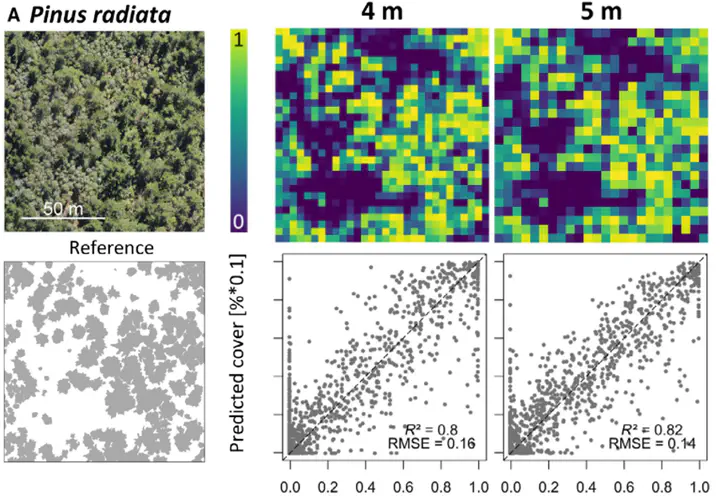 Abstract Unmanned Aerial Vehicles ( UAV ) greatly extended our possibilities to acquire high resolution remote sensing data for assessing the spatial distribution of species composition and vegetation characteristics. Yet, current pixel- or texture-based mapping approaches do not fully exploit the information content provided by the high spatial resolution. Here, to fully harness this spatial detail, we apply deep learning techniques, that is, Convolutional Neural Networks ( CNN s), on regular tiles of UAV -orthoimagery (here 2 – 5 m) to identify the cover of target plant species and plant communities. The approach was tested with UAV -based orthomosaics and photogrammetric 3D information in three case studies, that is, (1) mapping tree species cover in primary forests, (2) mapping plant invasions by woody species into forests and open land and (3) mapping vegetation succession in a glacier foreland. All three case studies resulted in high predictive accuracies. The accuracy increased with increasing tile size (2 – 5 m) reflecting the increased spatial context captured by a tile. The inclusion of 3D information derived from the photogrammetric workflow did not significantly improve the models. We conclude that CNN are powerful in harnessing high resolution data acquired from UAV to map vegetation patterns. The study was based on low cost red, green, blue ( RGB ) sensors making the method accessible to a wide range of users. Combining UAV and CNN will provide tremendous opportunities for ecological applications.