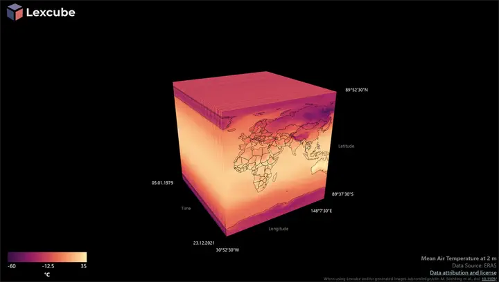 Lexcube, short for Leipzig Explorer of Earth Data Cubes, is a tool for the interactive visualization of large-scale Earth system data, developed at Leipzig University. Lexcube enables users to explore terabyte-scale remote sensing and modeling datasets in a three-dimensional data cube format, with space and time treated as equal dimensions. This approach allows for intuitive exploration and analysis of complex Earth system data, such as temperature changes or ecosystem dynamics, over time and space.