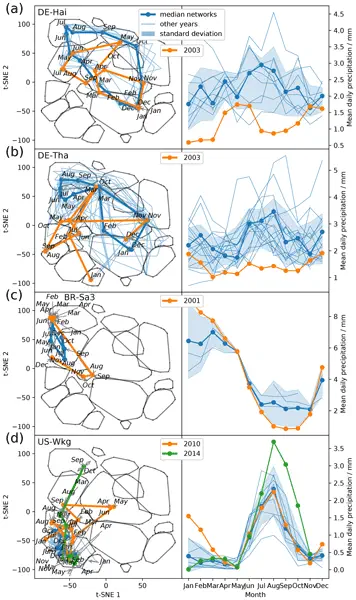Abstract. Understanding the dependencies of the terrestrial carbon and water cycle with meteorological conditions is a prerequisite to anticipate their behaviour under climate change conditions. However, terrestrial ecosystems and the atmosphere interact via a multitude of variables across temporal and spatial scales. Additionally these interactions might differ among vegetation types or climatic regions. Today, novel algorithms aim to disentangle the causal structure behind such interactions from empirical data. The estimated causal structures can be interpreted as networks, where nodes represent relevant meteorological variables or land-surface fluxes and the links represent the dependencies among them (possibly including time lags and link strength). Here we derived causal networks for different seasons at 119 eddy covariance flux tower observations in the FLUXNET network. We show that the networks of biosphere–atmosphere interactions are strongly shaped by meteorological conditions. For example, we find that temperate and high-latitude ecosystems during peak productivity exhibit biosphere–atmosphere interaction networks very similar to tropical forests. In times of anomalous conditions like droughts though, both ecosystems behave more like typical Mediterranean ecosystems during their dry season. Our results demonstrate that ecosystems from different climate zones or vegetation types have similar biosphere–atmosphere interactions if their meteorological conditions are similar. We anticipate our analysis to foster the use of network approaches, as they allow for a more comprehensive understanding of the state of ecosystem functioning. Long-term or even irreversible changes in network structure are rare and thus can be indicators of fundamental functional ecosystem shifts.